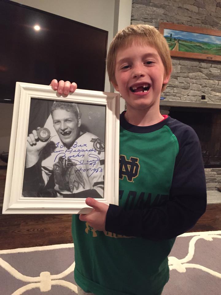 Hockey legend Bobby Hull wrote a note and sent his famous “missing teeth” picture that matched Ben’s current toothless look. Skylar Diggins, ND woman’s basketball great sent a video clip encouraging Beny. Former superstar goalie Mike Liut (Pat’s childhood idol when he was with the Hartford Whalers) sent a nice note and photo. Mathias Farley, captain of the Notre Dame football team sent a picture flashing 6 fingers. The entire pee-wee hockey league in his home town wore #6 on their helmets. The Bridport Sound Tigers invited Beny practice with them. When he was released from the hospital in Phoenix, the owner of the NHL Coyotes invited Ben and his parents to the locker room and the owner’s box for a game. The local news Channel 8 did a feature on him, and so did Fox Sports – with a number of cities around the country picking it up (I saw Boston and Indianapolis, but I’m sure there were more.) Links at the end of this blog post.