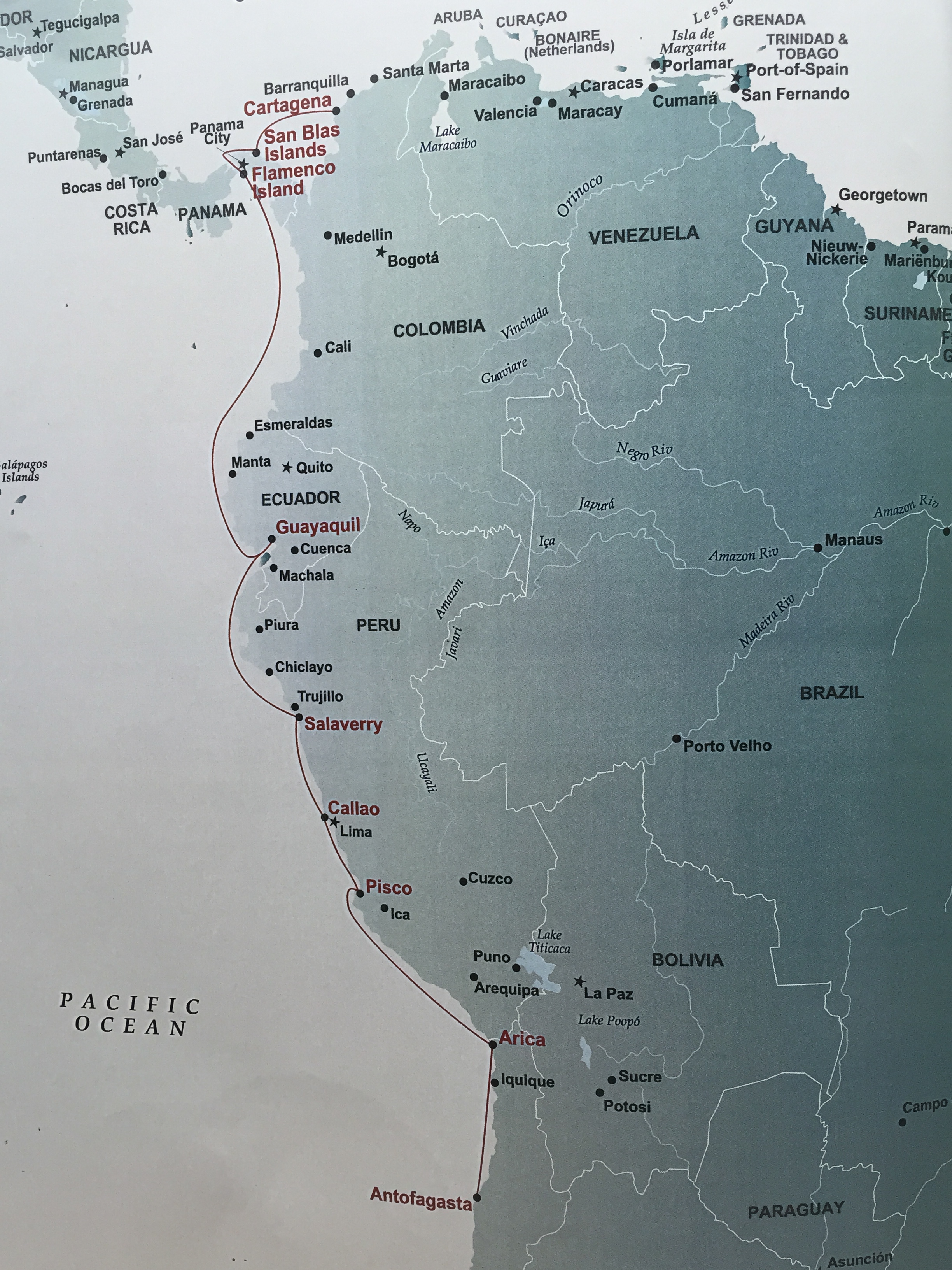 I guess I slept through the relevant geography class, but I learned that much of the western coast of South America is desert, hemmed in by the Andes Mountains – the second-highest mountain range after the Himalayas. The coast actually looks a bit like that of Namibia, Africa. The combination of desert and mountains creates some odd climates. Lima, Peru is cloudy for 9 months of the year. Santiago, Chile is in a bowl between mountains and often is hazy from trapped pollution. Unless you go up or over the mountains, the weather is not at all what you’d expect for a coastal region at the equivalent latitude of the Caribbean. The temperature throughout the region is consistently moderate – often cool if the sun isn’t out.