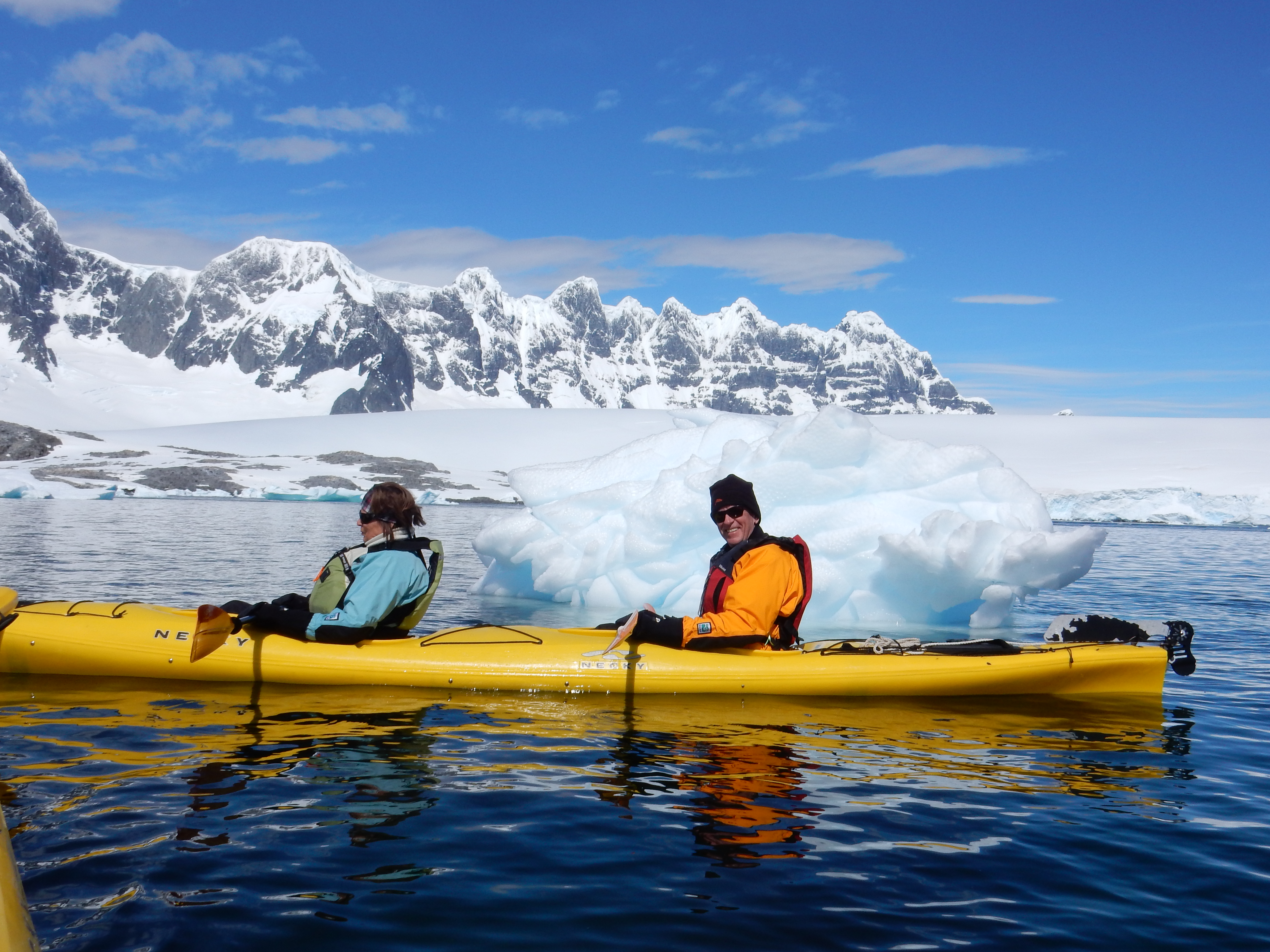 The weather in Antarctica was again spectacular and we signed up for a number of kayaking outings to enjoy the vistas. With the beautiful scenery, a trip through “iceberg alley” and sunsets that last for hours, I couldn’t stop taking pictures. I spent hours cutting photos down to less than 1,000. I’m sorry to subject you to the 20 or so included below, but I just can’t manage to delete them further. What I can’t seem to project, is the sense of scale. The mountains soar 9,000 feet from the sea, and the tabular icebergs we sailed right next too are 100-250 feet tall!