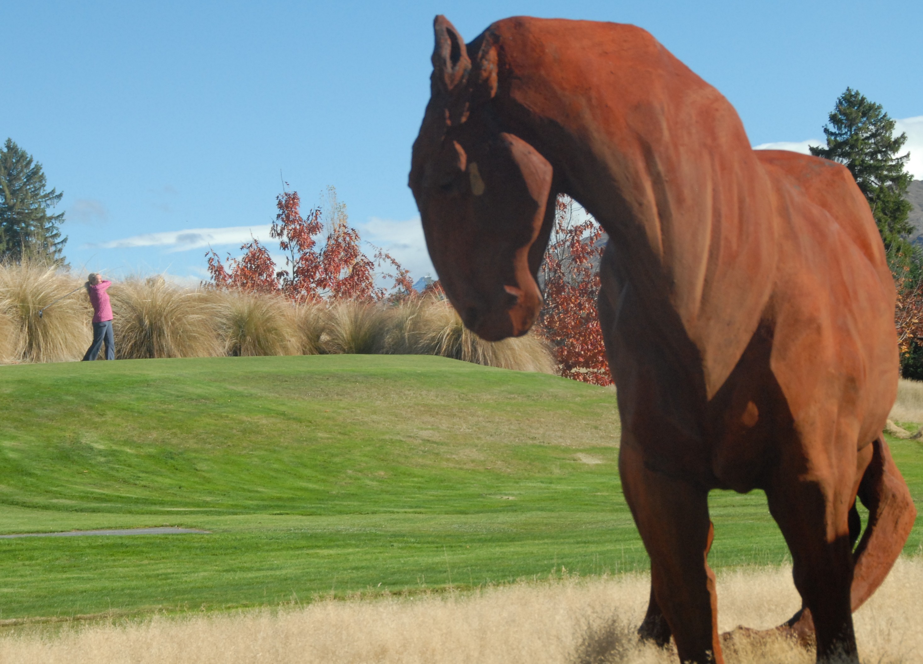 It was built originally for Michael Hills as his own private course. He is an owner of a number of very successful jewelry stores in New Zealand (partly funded by Debra’s recent purchases). It is an extremely challenging course, with gorgeous views from every tee. But wait, there’s more! He commissioned large sculptures on almost every hole. Some were modern, some were wind activated, but my favorite was a field of huge horses. Debra loved a hole that had large dragon flies hovering over a lake just in front of the green (in the slide show below). She called it the most beautiful course by far. I’m still not sure vs. Cape Kidnappers – though I played well at Cape but had 9 penalty strokes and lost 9 balls at The Hills, so that may have influenced my assessment. I am embarrassed to admit that I thought the U.S. had the monopoly on the world’s the most beautiful courses. I was wrong about that.