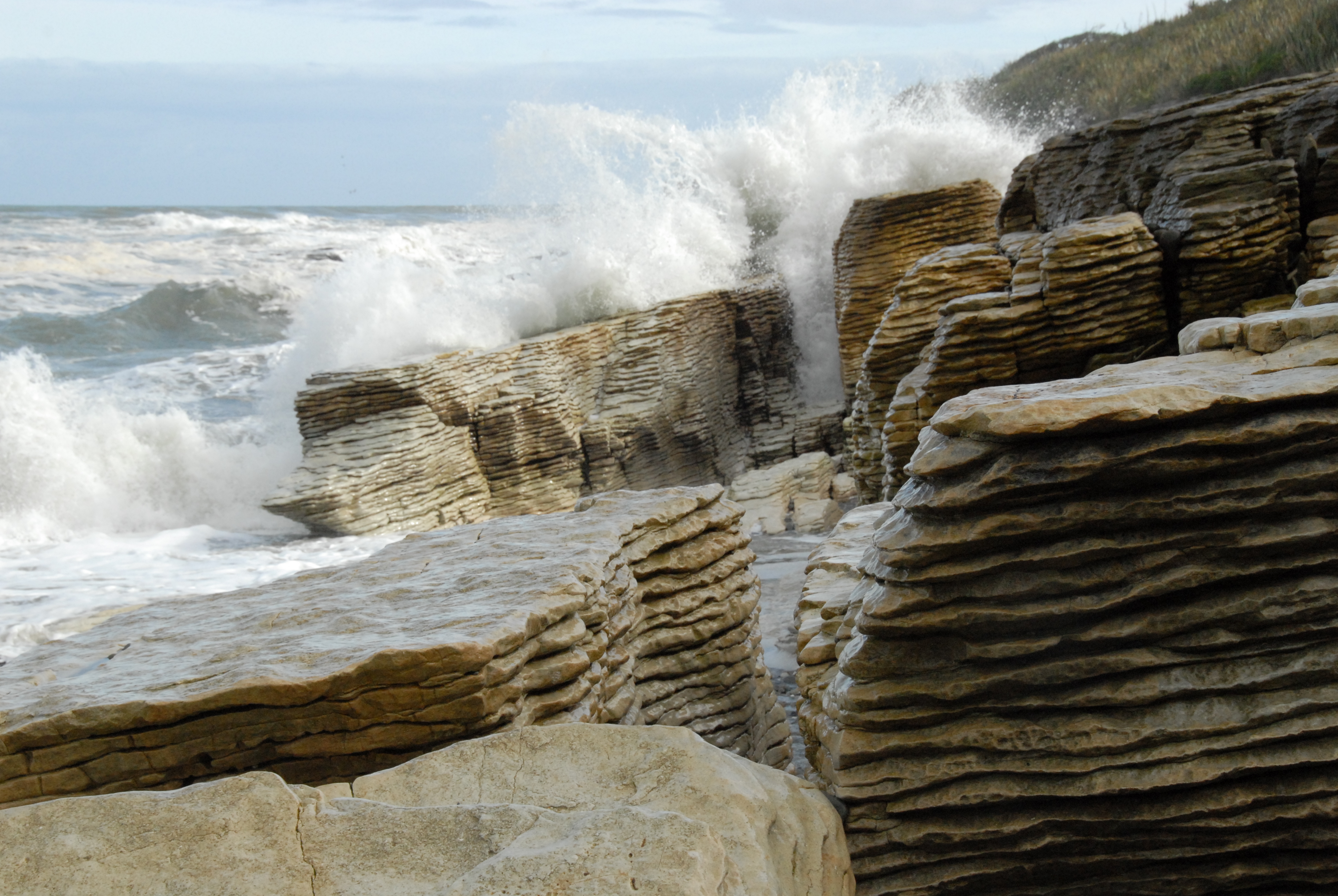 From there, we drove to the West Coast. It was as if we drove through the valleys of New England in October, then through the hills of Wyoming, and then down the rugged coast of Oregon to Big Sur in California – all in three hours! Driving on “the wrong side” through some white knuckle turns, I wasn’t able (allowed) to take any pictures. At last we found a small restaurant and had a relaxing lunch and watched the waves of the Tasman crashing against beautiful black rock formations.DSC_0571 Further down the coast is a former mining town called Punakaiki, now famous for weird rock formations on the beach that they call “pancake rocks” because they look like stacks of pancakes (not to me). The West Coast of NZ is really rugged on the South Island. There’s really not much civilization, and very few places to stay. We stayed at the best on the coast – think Motel 6 with a view. But they did wrap the plastic cups in plastic bags. That always cracks me up – like they wash, sanitize, and re-use them?? Also, note to self: when ordering a mixed drink in a new country, ask how big their shots are. In NZ, at a bar that makes them measure, 15ml is one shot, 1/3 of a U.S. shot. I stuck with beer!