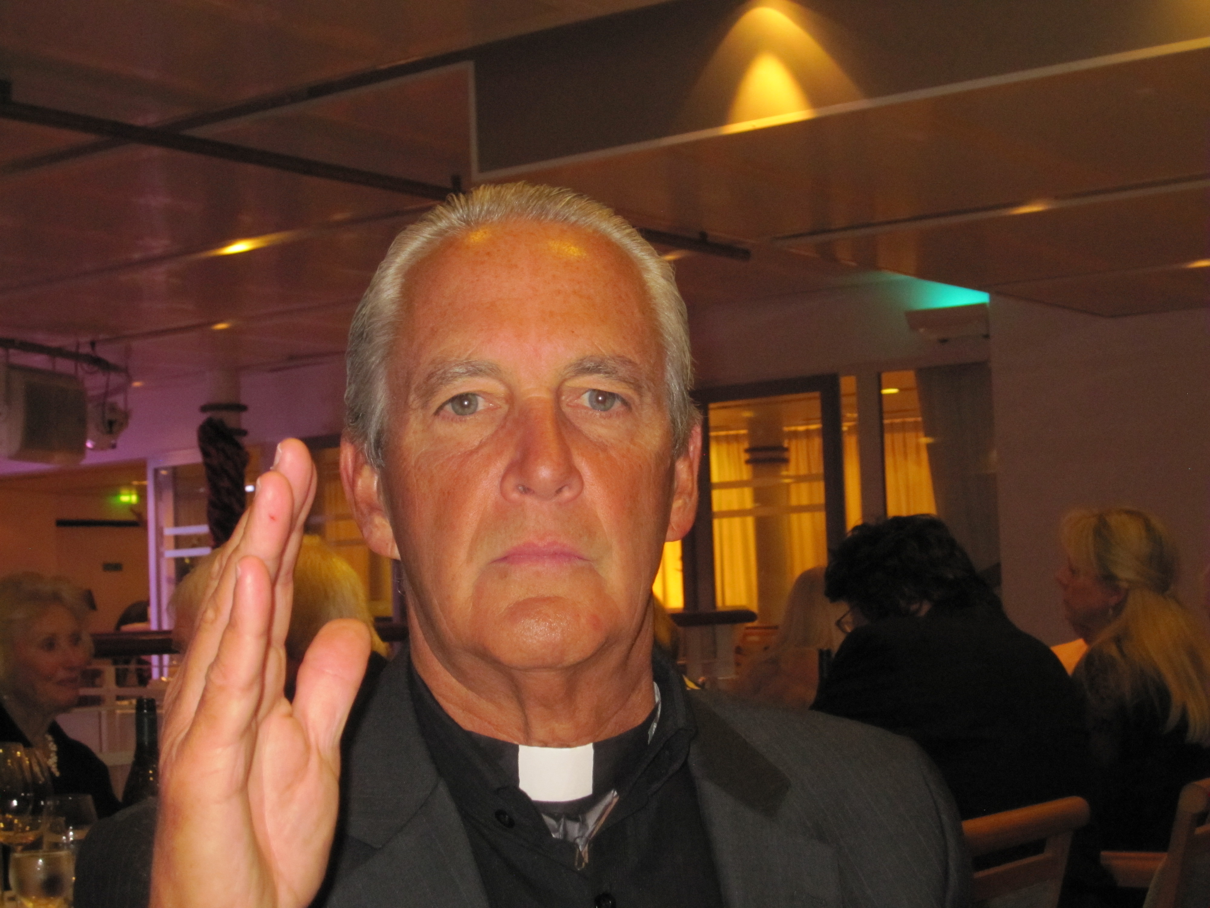 Those of you who know Doug, and what happens when we get together, probably wonder if we got kicked off the ship.  Well, almost.  Once a month or so, there’s a fancy dinner that requires a tux or dark suit.  We decided to go – even though we thought retirement should excuse us from such attire.