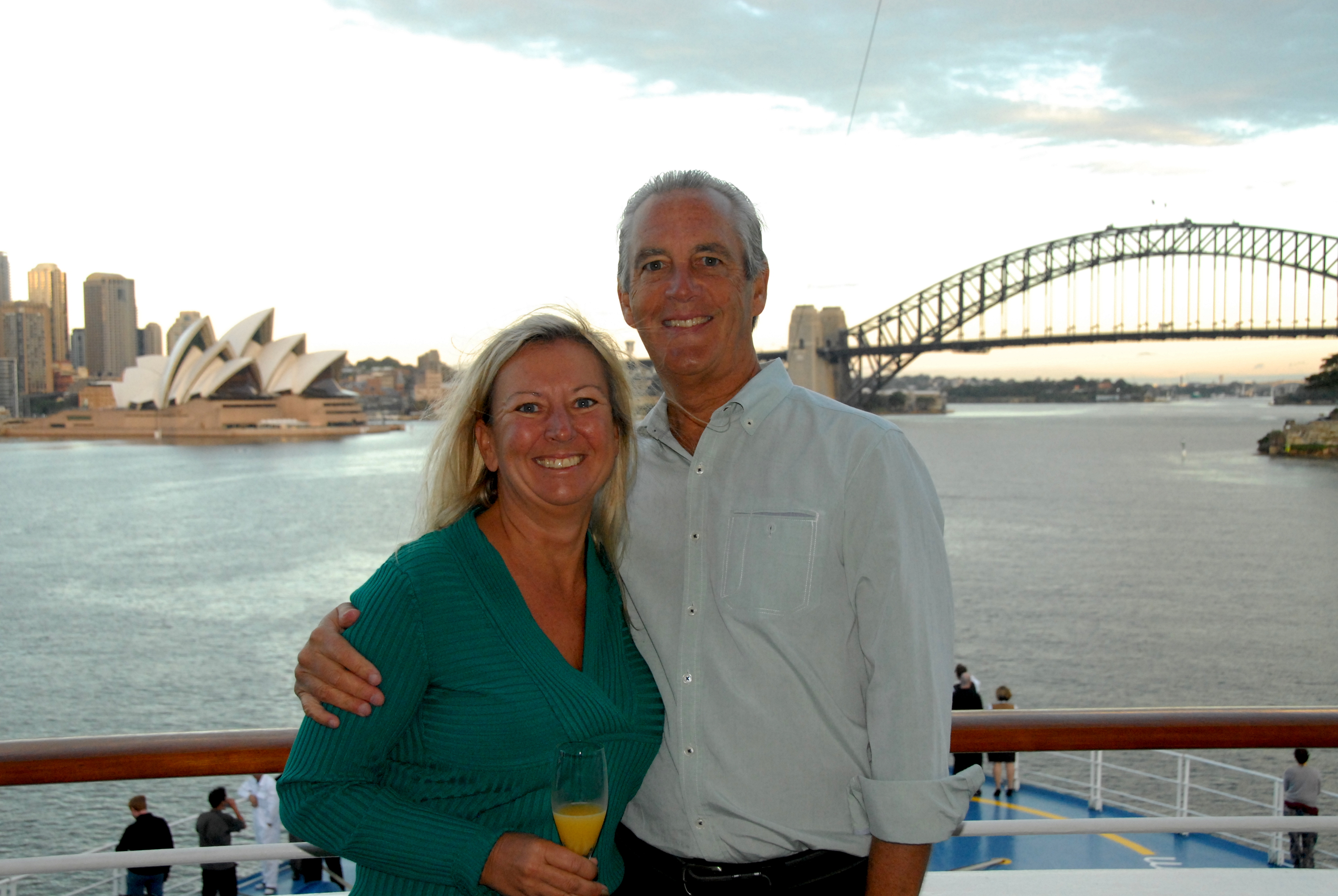 Sail-in PartyBecause we have a nice deck on the bow of the ship, we held a “sail-in” party for some new friends from the ship when we arrived in the port of Sydney.  The weather was perfect and the rising sun hit the city just as we passed it – a great start to a great country.