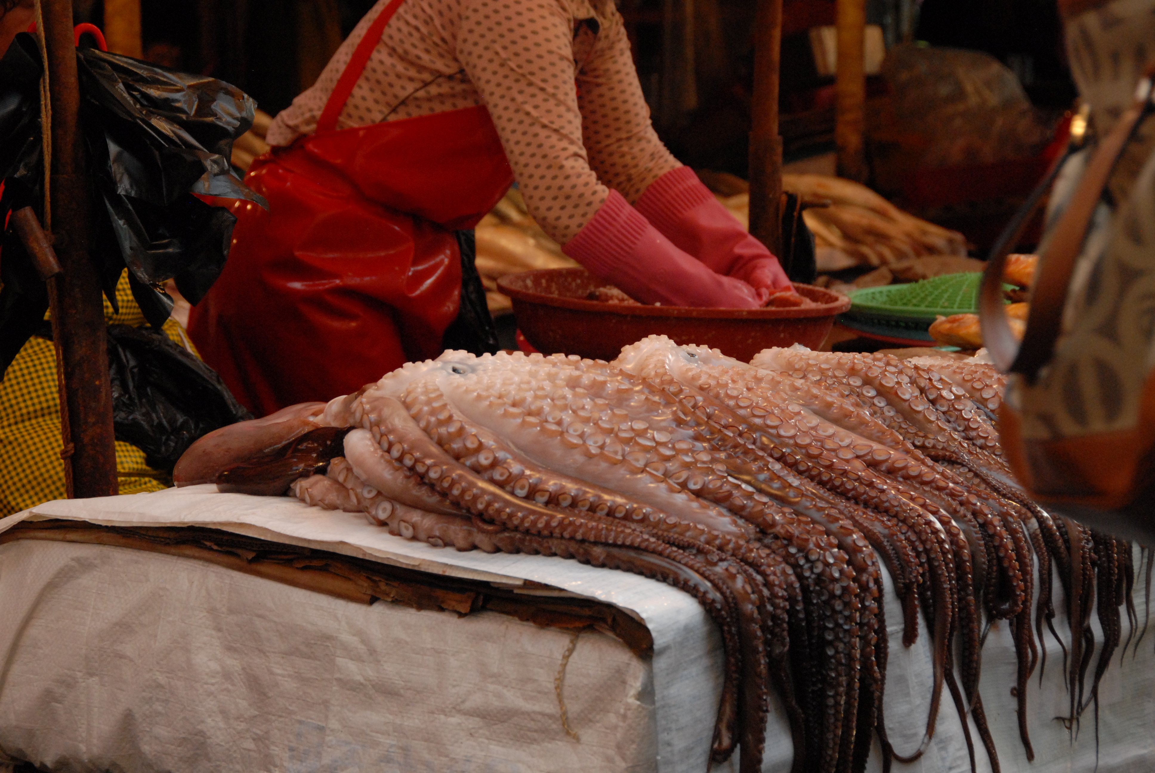 We started out at the fish market, where Daniel picked out a number of large live fish and other sea creatures for our breakfast.  Much of it was raw, including cut octopus whose arms were still squirming like worms and hung on to the plate with their suction cups like they knew their fate.  Of course, I had to try it for the video.  Don’t view this before morning coffee.