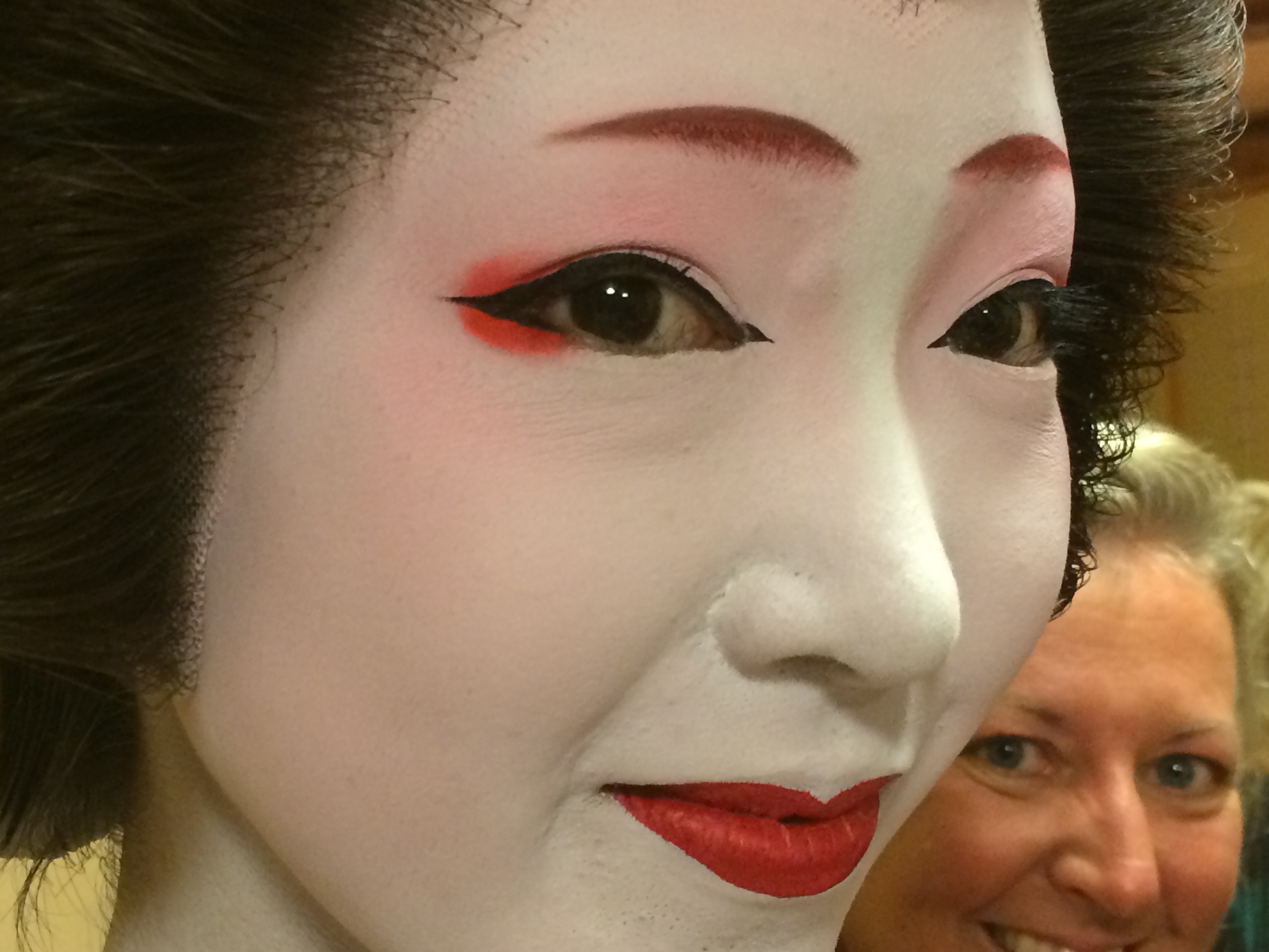 In the 1900’s, the concept evolved and split between courtesans and entertainers (Geisha). Geisha became an honorable profession and a way for lower-class girls to learn music, dance, singing, and conversational skills and enjoy a better life. They joined Geisha houses (leaving familial relationships behind) at a young age (not until 15 years old today) and then progressed through extensive training and “promotions” – much like someone might enter a religious seminary to become a priest or minister. While prostitution existed in the history of the Geisha, today they’re entertainers who are skilled at making businessmen feel special so they spend more money eating and drinking. FYI, the make-up job takes one hour to apply!